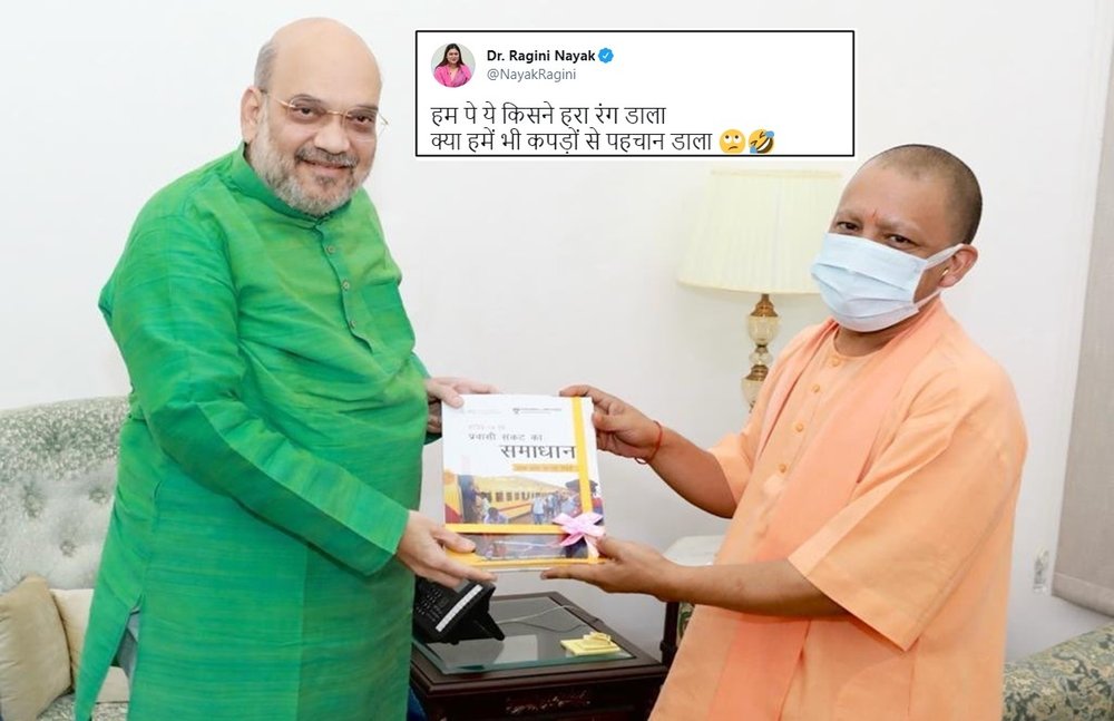 इस तस्वीर पर चुटकी लेते हुए कांग्रेस प्रवक्ता रागिनी नायक ने लिखा कि हम पर यह हरा रंग किसने डाला। क्या हमें भी कपड़ों से पहचान डाला। रागिनी नायक के इस ट्वीट पर अनुज श्रीवास्तव नाम के यूजर ने मजे लेते हुए लिखा कि लगता है चिढ़ा रहे हैं। वो तो दिल्ली है। अगर यूपी होता तो हरे रंग पहनने पर रासुका लग जाती।