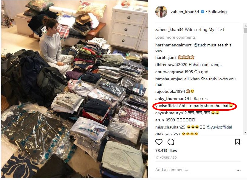 जहीर खान के फोटो पोस्ट होते ही लोगों के कमेंट्स आने शुरू हो गए। देखते ही देखते जहीर का ये इंस्टाग्राम पोस्ट वायरल होने लगा। लोग कमेंट कर लिख रहे हैं कि जहीर आप बहुत लकी हो। वहीं बहुत से लोग लिख रहे हैं कि ये सब शादी के साइड इफेक्ट्स हैं। जहीर खान के साथी क्रिकेटर युवराज सिंह ने भी कमेंट किय़ा। युवराज ने कमेंट करते हुए सागरिका घाटगे का मजाक उड़ान की कोशिश की। युवराज ने कमेंट कर लिखा कि अभी तो पार्टी शुरू हुई है।