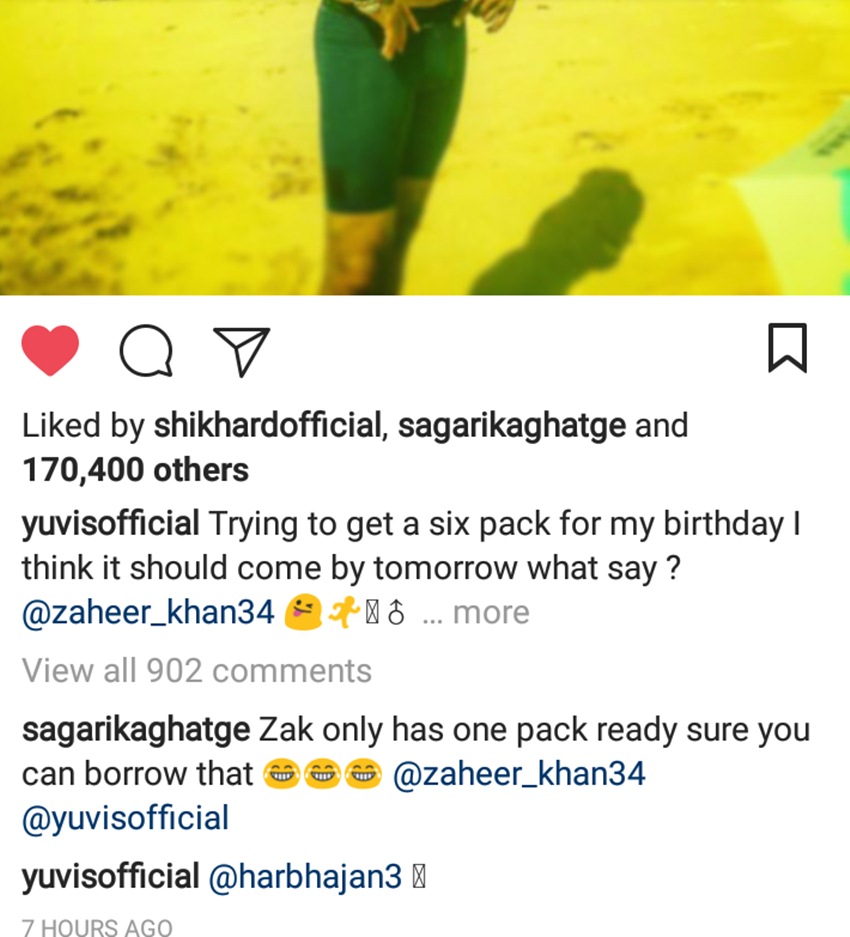 लोगों के साथ ही जहीर खान की पत्नी सागरिका घाटगे भी युवराज के मजे लेने के लिए उनके पोस्ट पर कूद पड़ीं। सागरिका ने भी युवराज की फिरकी ले ली। सागरिका ने लिखा कि जहीर खान के सिर्फ एक पैक एब हैं, अब उनसे भी उधार ले सकते हैं।