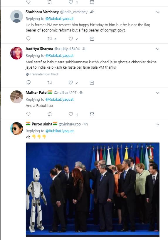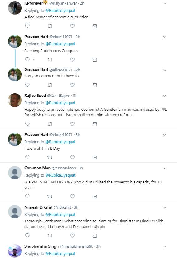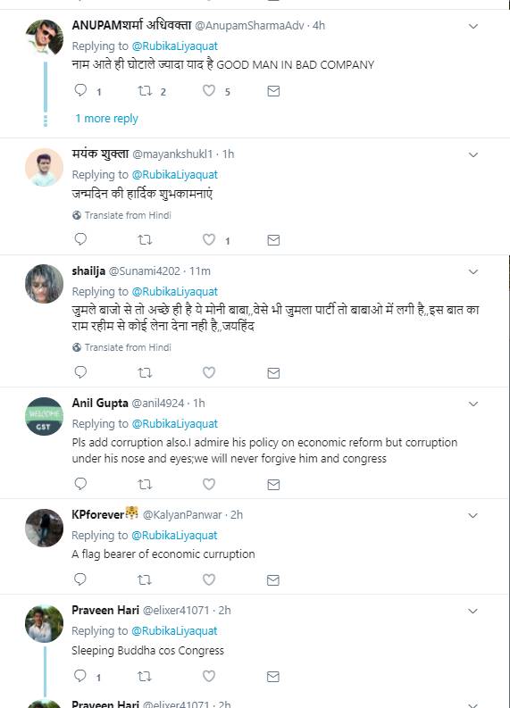 रुबिका लियाकत के इस ट्वीट पर बहुत से लोगों ने कमेंट किया। ज्यादातर ने रुबिका के ट्वीट से असहमति जताते हुए लिखा कि क्या आप वाकई में सीरियस हैं जो ऐसी बातें कर रही हैं। वहीं कुछ लोगों ने उनसे ये सवाल भी पूछ लिया कि आपने मनमोहन सिंह की तारीफ में जो बातें लिखी हैं उसके लिए क्या अपने चैनल और अपने मालिक से परमिशन ली है?