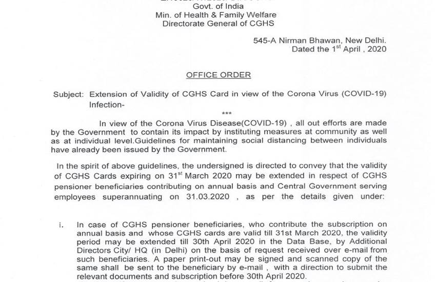 7th Pay Commission, 7th CPC Latest News Today 2020: नोवल कोरोना (Coronavirus) संकट के बीच केंद्रीय कर्मचारियों के पक्ष में मोदी सरकार लगातार राहत भरे फैसले ले रही है। महंगाई भत्ते (DA) में बढ़ोत्तरी और वार्षिक प्रदर्शन मूल्यांकन रिपोर्ट (APAR) फाइल करने की अंतिम तारीख को 30 जून तक बढ़ाने के बाद अब सरकार ने सेंट्रल गवर्नमेंट हेल्थ स्कीम (CGHS) के तहत राहत दी है। सरकार ने पेंशनर्स और 31 मार्च को रिटायर हुए कर्मचारियों के लिए सीजीएचएस कार्ड की वैलिडिटी को 30 अप्रैल तक के लिए बढ़ा दिया है।