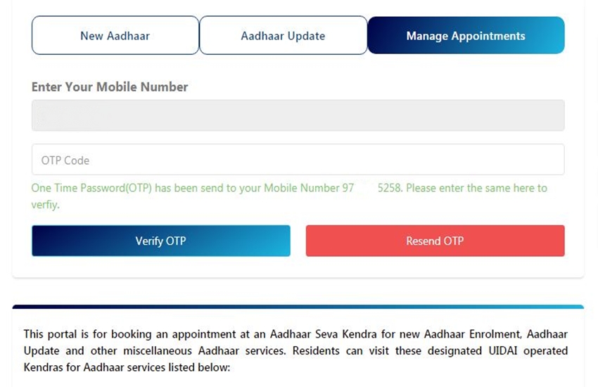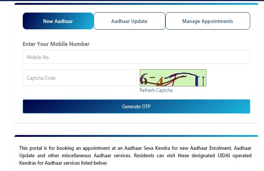 6. इसके बाद आपको तीन विकल्प New Aadhaar, Aadhaar Update or Manage Appointments नजर आएंगे। आपको Manage Appointments पर क्लिक करना है और अपना मोबाइल नंबर कैप्चा कोड डालकर जनरेट OTP पर क्लिक करना है।