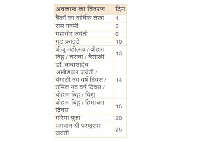 1 अप्रैल को वार्षिक क्लोजिंग के चलते बैंक बंद थे वहीं 2 तरीखा को राम नवमी के चलते बैंक बंद रहे। 6 तारीख को महावीर जयंती की वजह से बैंक बंद रहेंगे। 10 तारीख को गुड फ्राइडे है और इस दिन भी बैंक बंद रहेंगे। वहीं 13 अप्रैल को बीजु फेस्टिवल/बोहाग बिहू/चैराओबा/बैसाखी की वजह से बैंकों को बंद रखा जाएगा।