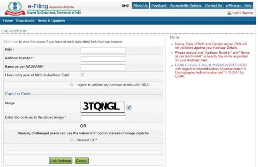 कैसे करें लिंक: पैन को आधार से लिंक करने का सबसे अच्छा तरीका यह है आप आयकर विभाग की ई-फाइलिंग वेबसाइट पर जाएं।। ‘क्विक लिंक्स’ के नीचे बाईं ओर के कॉलम में ‘लिंक आधार’ पर क्लिक करें।यहां आपको अपना पैन, आधार और नाम साझा करना होगा। जिसके बाद पैन-आधार लिंकिंग को पूरा करने के लिए एक ओटीपी आएगी।आयकर विभाग आपके आधार विवरण से पैन के अनुसार आपका नाम, जन्म तिथि और लिंग को मान्य करेगा। ऐसे मामलों में जहां आधार कार्ड पर नाम पैन कार्ड में नाम पूरी तरह से अलग हो ऐसे में उस व्यक्ति को दोनों डेटाबेस में अपना नाम बदलना होगा या व्यक्तिगत रूप से पैन आवेदन केंद्र पर जाना होगा और बॉयोमीट्रिक आधार प्रमाणीकरण कराना होगा।