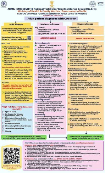 गंभीर मामलों के तहत आईसीयू/एचडीयू में भर्ती उन कोरोना मरीजों के मामले में एनआईवी (हेल्मेट या फेस मास्क इंटरफेस- उपलब्धता के आधार पर) का इस्तेमाल किया जाना चाहिए, जिन्हें अधिक ऑक्सीजन की जरूरत पड़ने वाली हो। एचएफएनसी के प्रयोग पर भी विचार किया जा सकता है। गाइडलाइन के मुताबिक, एवोलेमा को बरकरार रखना चाहिए, जबकि सेप्टिक शॉक (अगर जरूरत हो तो) को मौजूदा प्रोटोकॉल और लोकल एंटीबायोग्राम के तहत किया जाना चाहिए।