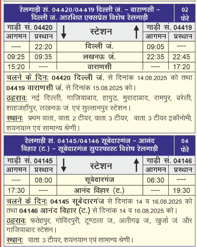 उत्तर रेलवे द्वारा दी गई जानकारी के अनुसार, ट्रेन संख्या 04420 दिल्ली जंक्शन से वाराणसी आरक्षित एक्सप्रेस स्पेशल ट्रेन 14 अगस्त 2025 को चलाई जाएगी जबकि ट्रेन संंख्या 04419 वाराणसी से दिल्ली जंंक्शन आरक्षित एक्सप्रेस स्पेशल ट्रेन का संचालन 15 अगस्त 2025 को किया जाएगा।