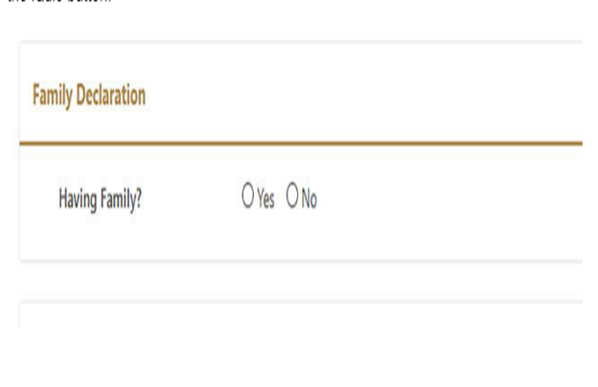 3. इसके बाद एक नया वेबपेज ओपन होगा। इसमें आपसे परिवार के बारे में सवाल किए जाएंगे। आपसे ‘Family Declaration’ के तहत पूछा जाएगा कि आपका परिवार है या नहीं। आपको Yes और No में जवाब देना।