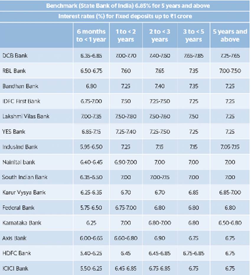 Yes Bank:6 महीने से एक साल के लिए अगर आप Yes Bank में कोई एफडी कराते हैं तो आपको 6.85-7.15 प्रतिशत की ब्याज दर मिलेगी। वहीं एक से दो साल के लिए एफडी कराने पर 7.25-7.40 प्रतिशत की ब्याज दर मिलेगी। दो से तीन साल की एफडी पर 7.25-7.50 प्रतिशत ब्याज दर मिलेगी। तीन से पांच साल पर आपको 7.25 ब्याज दर मिलेगी। जबकि पांच साल और उससे से ज्यादा समय पर एफडी पर ब्याज दर7.25 प्रतिशत होगी।