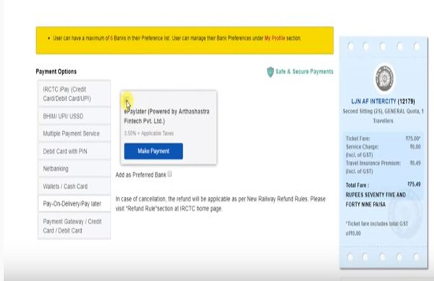 इसके लिए सबसे पहले आपको ICRCTC की आधिकारिक वेबसाइट पर जाना होगा। यहां पर अपनी डिटेल्स डालने के बाद आपको पेमेंट वाले ऑप्शन पर आपको ePaylater का फीचर नजर आता है।