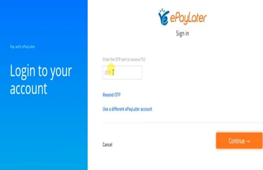 इसके बाद आप ePaylater वाले अकाउंट पर रिडायरेक्ट हो जाएंगे। ध्यान रहे अगर आपका अकाउंट पहले से बना होगा तो तभी आप रिडायरेक्ट होंगे।
