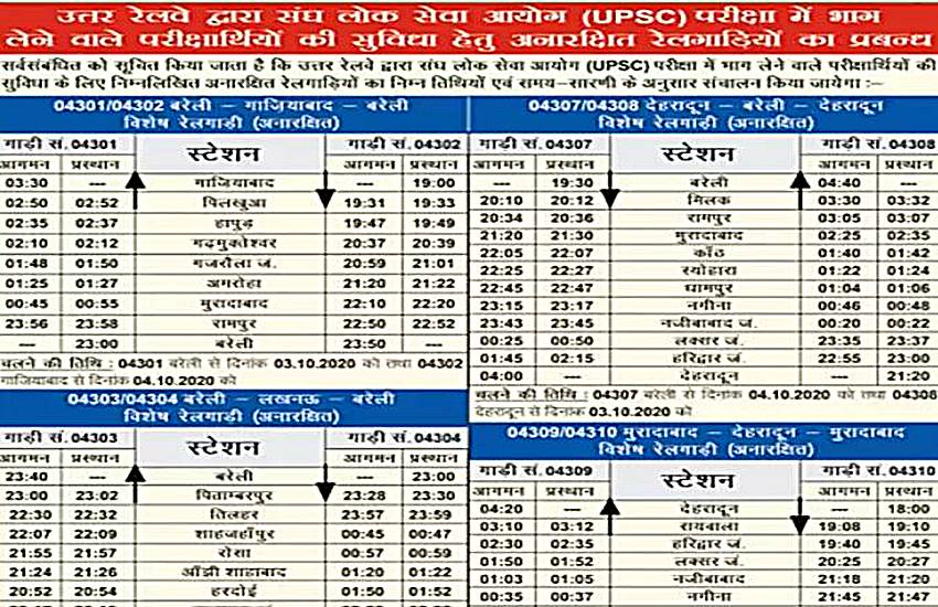 Indian Railway, IRCTC, UPSC Exam 2020: संघ लोक सेवा आयोग (यूपीएसएसी) की परीक्षा 4 अक्टूबर होगी। लाखों छात्र इस परीक्षा को देने के लिए तैयार हैं। बड़े स्तर पर छात्रों के मूवमेंट को ध्यान में रखते हुए भारतीय रेलवे ने भी कमर कस ली है। उत्तर रेलवे ने छात्रों के लिए अनारक्षित ट्रेनों का संचालन कर रही है।