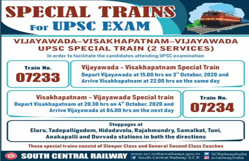 वहीं दक्षिण मध्य रेलवे (SCR) जोन के विजयवाड़ा डिवीजन ने घोषणा की है कि वह सिविल सेवा के इच्छुक उम्मीदवारों की सुविधा के लिए विजयवाड़ा और विशाखापट्टनम के बीच दो विशेष ट्रेनें चलाएगा। विशेष ट्रेन दोनों दिशाओं में एलुरु, ताडेपल्लीगुडम, निदाडावोलु, राजमुंदरी, समालकोट, त्यूनी, अनकापल्ली और दुवदा स्टेशनों पर रुकेगी।