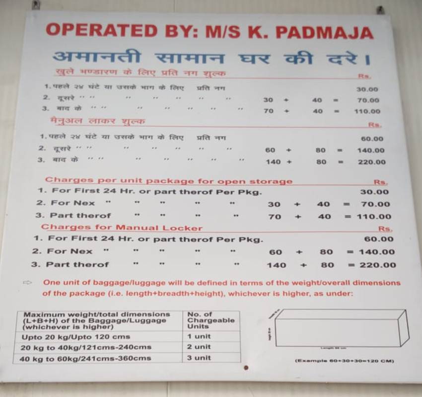 निजामुद्दीन स्टेशन पर अमानती घर का संचालन करने वाली फर्म M/S K.PADMAJA के मुताबिक, एक बैग/लगेज के लिए अमानती घर का किराया उसके वजन या फिर उसके आकार (लंबाई, चौड़ाई और ऊंचाई) के आधार पर मापा जाएगा और इनमें जो चीज अधिक होगी, उसी आधार पर किराया लिया जाएगा।