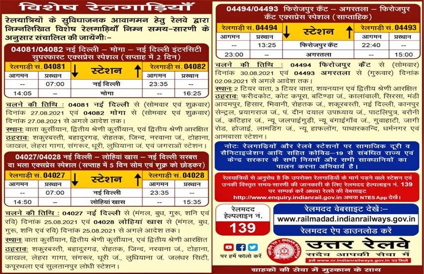 उत्तर रेलवे ने अपने आधिकारिक ट्वीटर हैंडल के जरिए इस बात की जानकारी दी है। ट्वीट में ट्रेनों की सूची और नया टाइम टेबल भी साझा किया गया है। आप भी यात्रा करने का मन बना रहें है तो आपके लिए इस बदलाव के बारे में जानना जरूरी है।