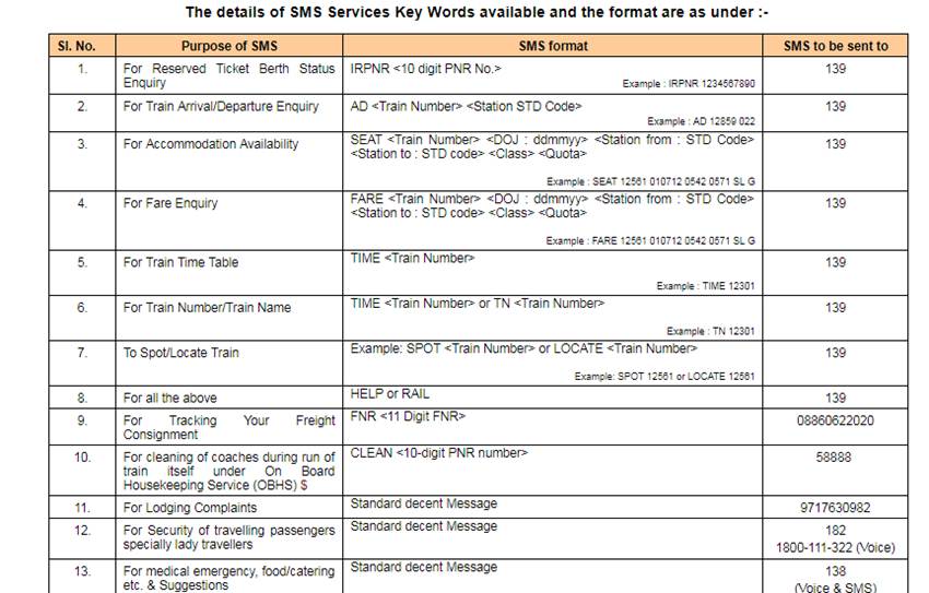 इसके अलावा 139 रेलवे इंक्वायरी कस्टमर केयर नंबर पर आप पीएनआर इंक्वायरी, किराया संबंधी जानकारी और अन्य सारी जानकारियां प्राप्त कर सकते हैं। इस नंबर पर टेक्स्ट मैसेज करके भी जानकारी भी प्राप्त कर सकते हैं।ट्विटर के जरिए भी आप यात्रा के दौरान मदद ले सकते हैं। सुरक्षा, भ्रष्टाचार, खाद्या सामाग्री और इनसे जुड़ी किसी शिकायत के लिए आप @RailMinIndia and @EasternRailway के ट्विटर हैंडल पर ट्वीट कर मदद मांग सकते हैं।