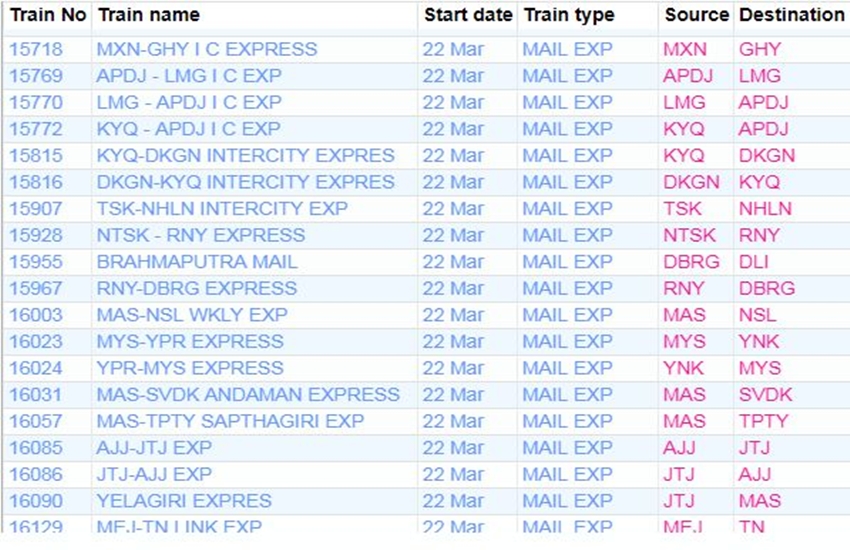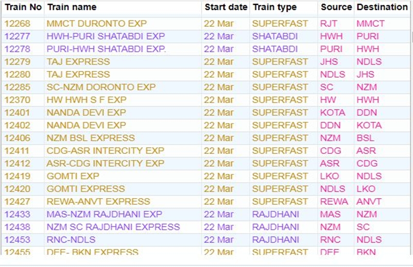 IRCTC Cancelled Trains List Today: रेलवे ने आज रविवार यानी 22 मार्च 2020 को कई रेलगाड़ियां रद्द कर दी हैं। यदि आप भी आज ट्रेन से सफर करने वाले हैं तो घर से निकलने से पहले चेक कर ले कहीं आपकी ट्रेन भी तो रद्द नहीं है। आप लोगों की जानकारी के लिए बता दें कि आज 933 ट्रेनें कैंसिल की गई हैं और इसमें 795 रेलगाड़ियां पूरी तरह रद्द हैं, जबकि 138 ट्रेन आंशिक रूप से कैंसल हैं।