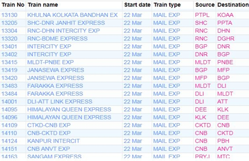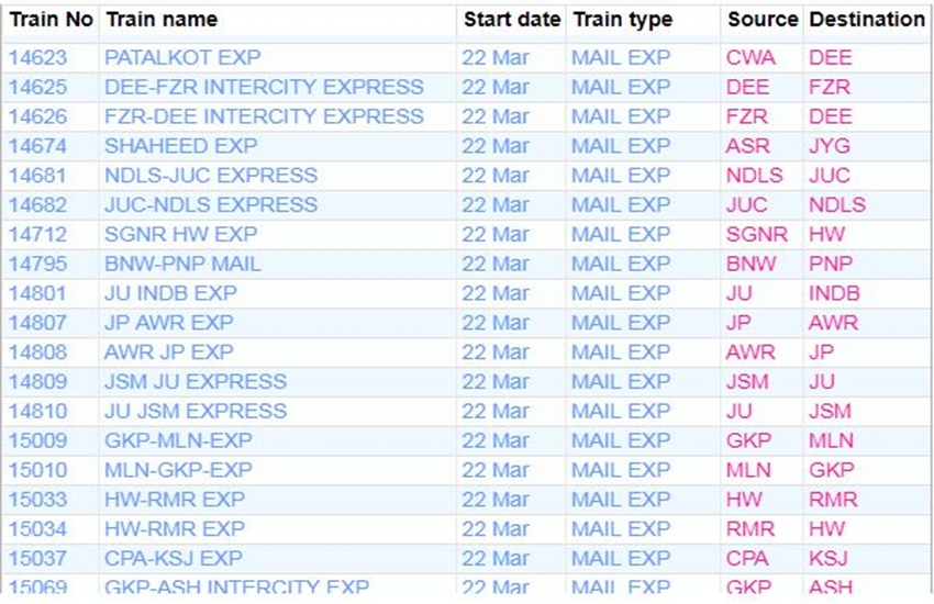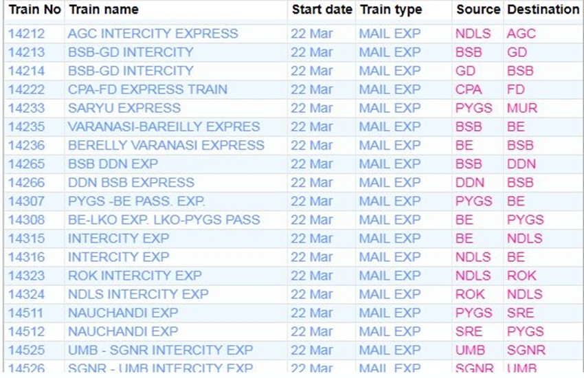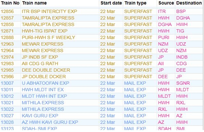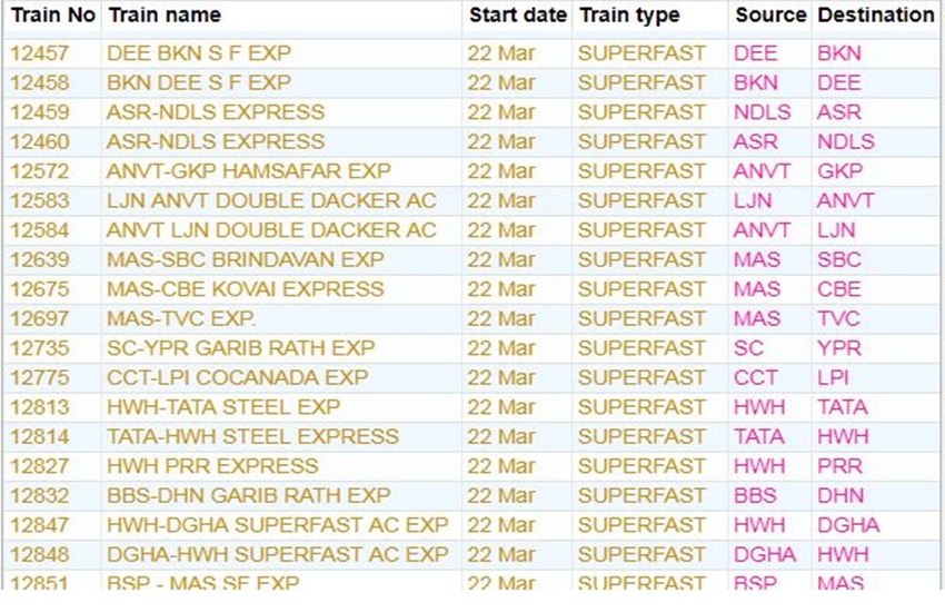 आपकी सुविधा के लिए हम कुछ प्रमुख ट्रेनों की लिस्ट को साझा कर रहे हैं। लिस्ट में आपको रद्द हुई ट्रेन का नंबर, नाम और रेलगाड़ी का रूट जैसी जानकारियां मिल जाएगी। अगर इस लिस्ट में आपकी ट्रेन नहीं है तो आप यहां क्लिक करके रेलवे की पूरी जानकारी अपने मोबाइल पर पा सकते हैं।