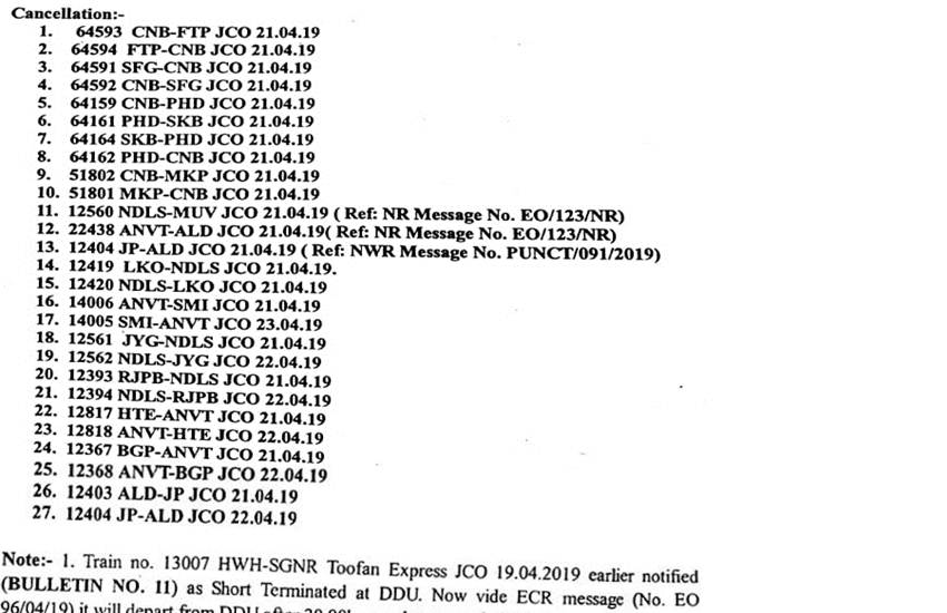 जिन ट्रेनों को रद किया गया है, उनमें नई दिल्ली-इलाहाबाद हमसफर एक्सप्रेस, जयपुर-इलाहाबाद एक्सप्रेस, गोमती एक्सप्रेस और बिहार के सीतामढ़ी से चलकर आनंद विहार तक जाने वाली लिच्छवी एक्सप्रेस, पटना से नई दिल्ली जाने वाली संपूर्ण क्रांति एक्सप्रेस शामिल है। कुछ पैसेंजर ट्रेनों को भी रद्द किया गया, जिनमें इलाहाबाद-कानपुर पैसेंजर अप-डाउन, कानपुर-फफुंद पैसेंजर अप-डाउन, कानपुर-मानिकपुर पैसेंजर अप-डाउन, फतेहपुर-कानपुर पैसेंजर अप-डाउन शामिल है।