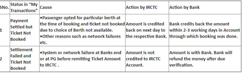 Payment Settled but Ticket Not Booked: अगर आपके पास Payment Settled but Ticket Not Booked जैसा नोटिफिकेशन आता है तो आईआरसीटीसी अगले दिन आपका पैसा आपके बैंक को लौटा देता है जिसके बाद आपका बैंक अगले दो तीन-दिन में आपके अकाउंट में पैसे वापस क्रेडिट कर देता है। इस तरह के टिकट ना बुक हो पाने का कारण यह हो सकता है कि यूजर ने किसी विशेष बर्थ का चुनाव किया हो लेकिन टिकट उस बर्थ की मिल नहीं पाई हो। इसके अलावा नेटवर्क की वजह से भी ऐसा हो सकता है।