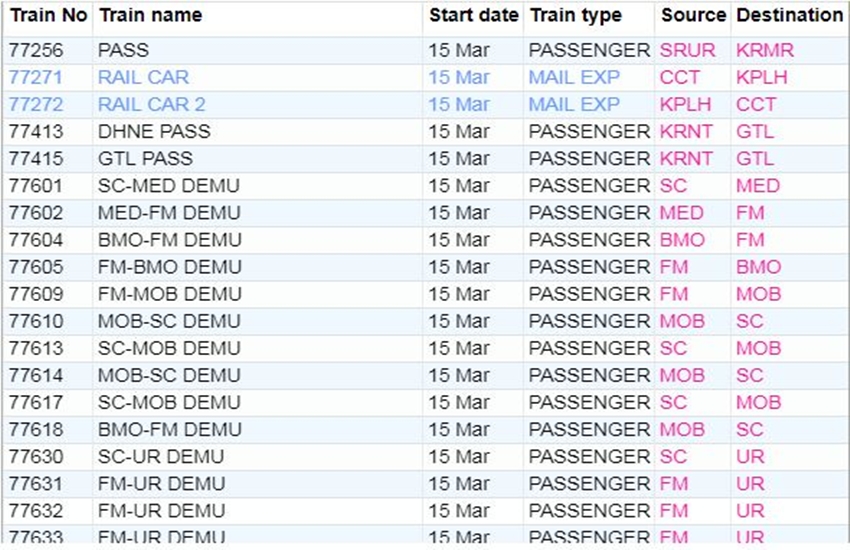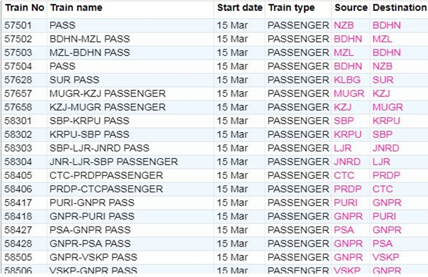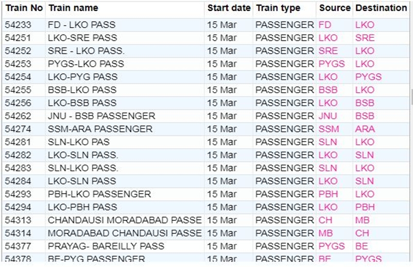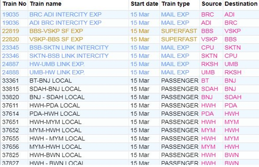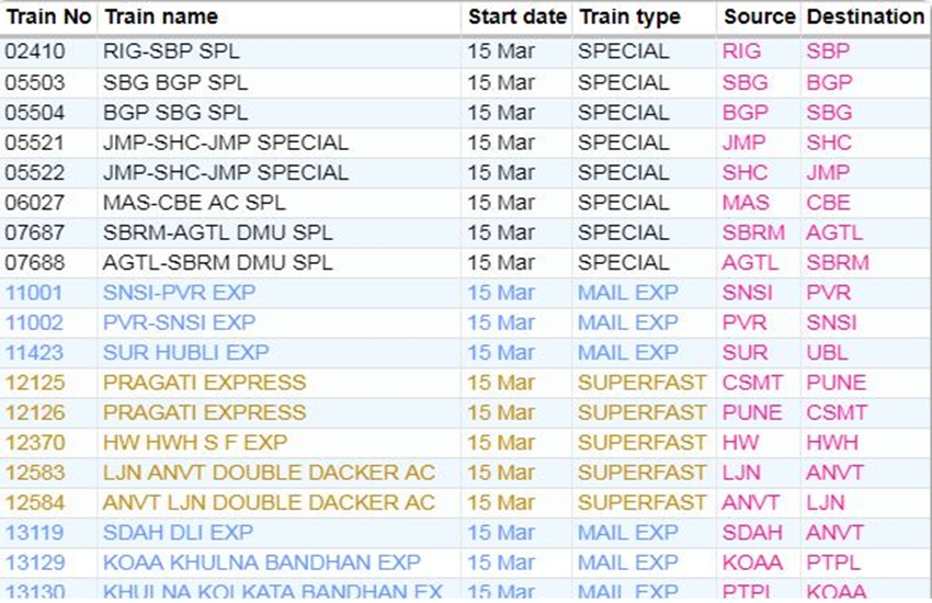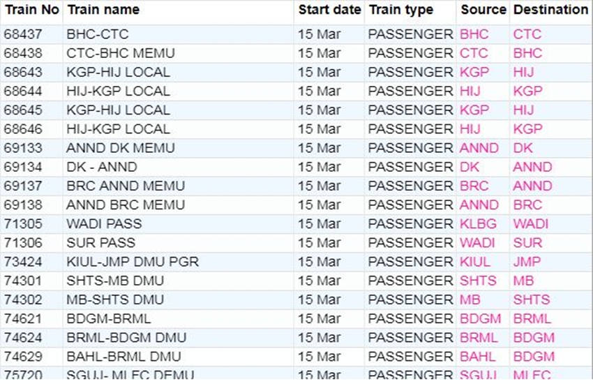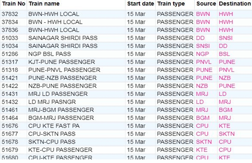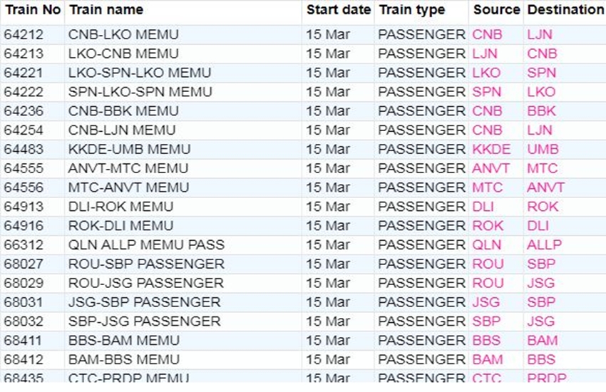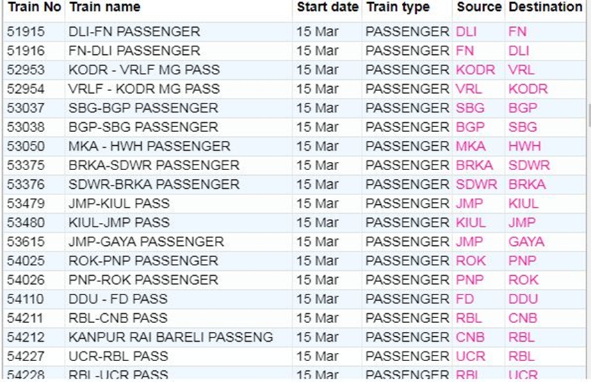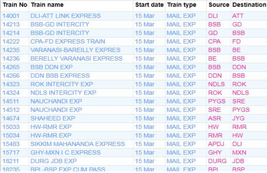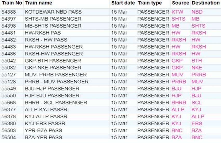 रेलवे ने आज रविवार यानी 15 मार्च 2020 को कई ट्रेनों की यात्रा को कैंसिल कर दिया। यदि आप भी आज से ट्रेन से सफर करने वाले हैं तो घर से निकलने से पहले चेक कर ले कहीं आपकी ट्रेन भी तो कैंसिल नहीं। अगर आप बिना चेक किए स्टेशन पर पहुंचते हैं और पता लगता है कि ट्रेन कैंसिल है तो समय के साथ-साथ ऊर्जा भी खत्म होती है। आप लोगों की जानकारी के लिए बता दें कि आज 311 ट्रेनें कैंसिल की गई हैं और इसमें 215 पूरी तरह कैंसिल हैं, जबकि 96 ट्रेन आंशिक रूप से कैंसिल हैं। आपकी सुविधा के लिए हम कुछ प्रमुख ट्रेनों की लिस्ट को साझा कर रहे हैं। लिस्ट में आपको कैंसिल हुई ट्रेन का नंबर, नाम और रेलगाड़ी का रूट जैसी जानकारियां मिल जाएगी।