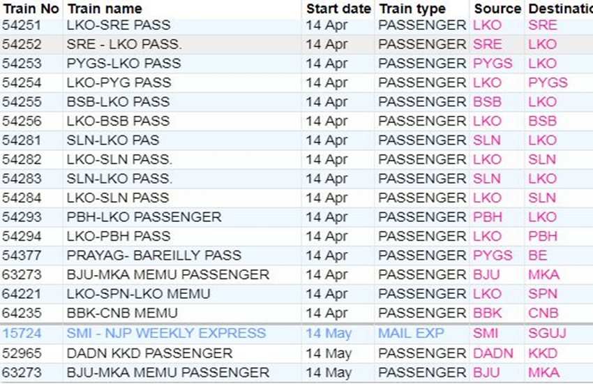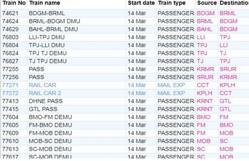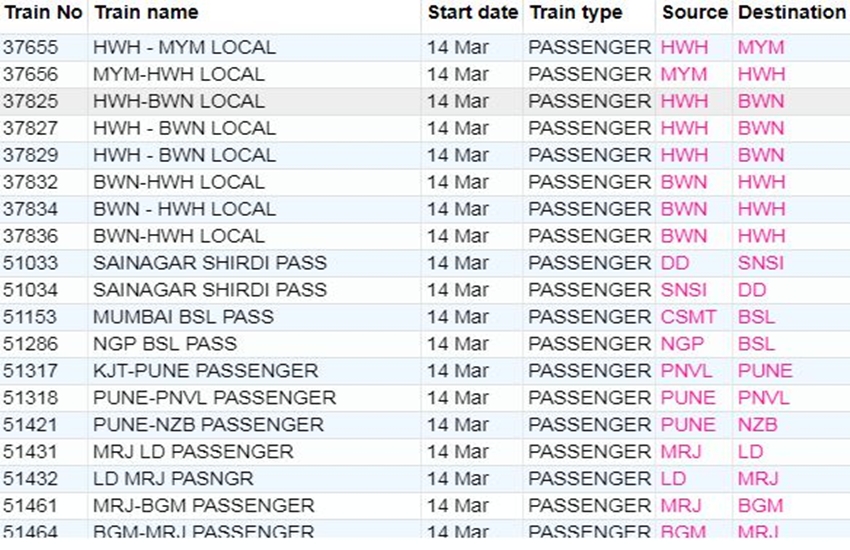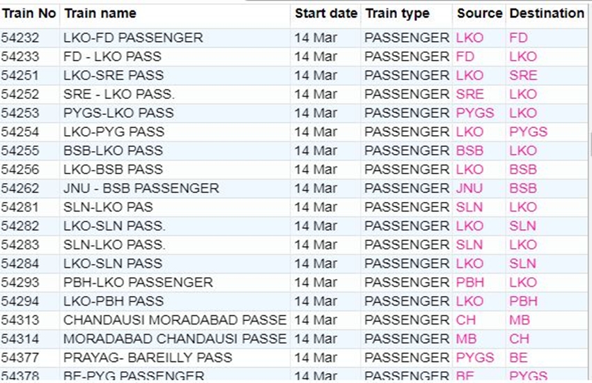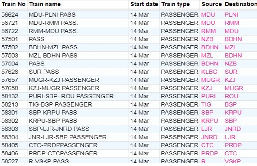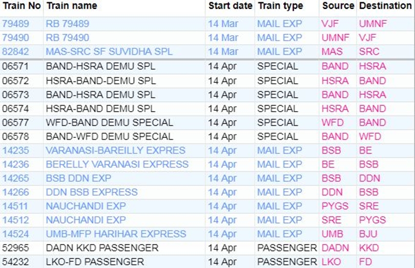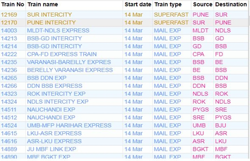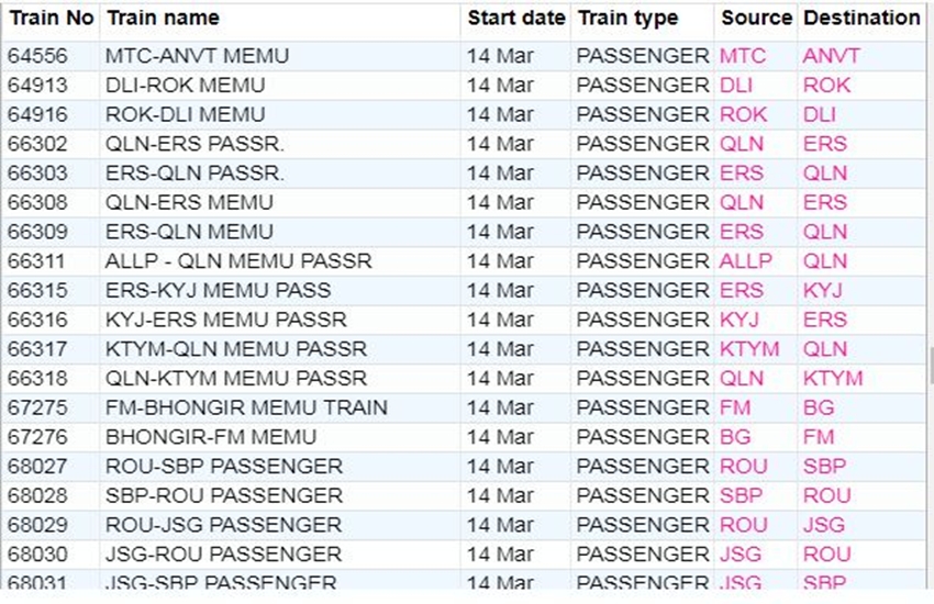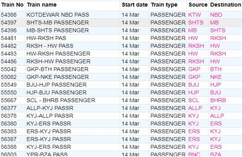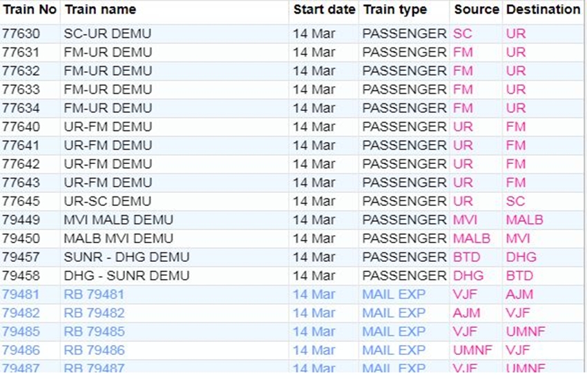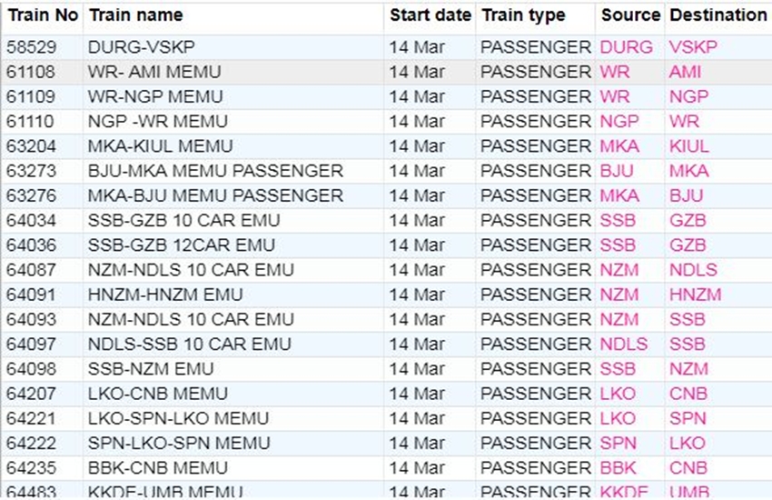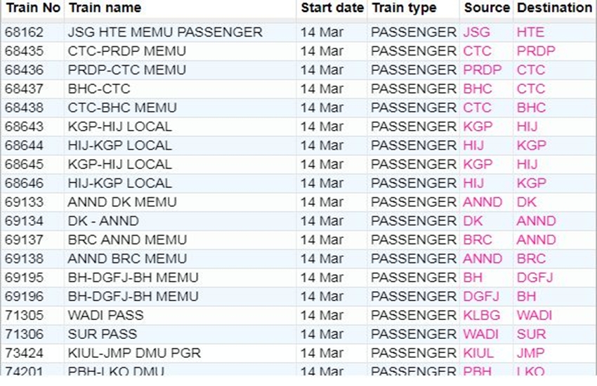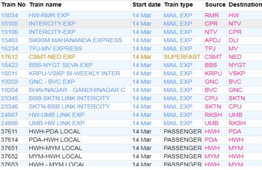 रेलवे ने आज शनिवार यानी 14 मार्च 2020 को कई ट्रेनों की यात्रा को कैंसिल कर दिया। यदि आप भी आज से ट्रेन से सफर करने वाले हैं तो घर से निकलने से पहले चेक कर ले कहीं आपकी ट्रेन भी तो कैंसिल नहीं। अगर आप बिना चेक किए स्टेशन पर पहुंचते हैं और पता लगता है कि ट्रेन कैंसिल है तो समय के साथ-साथ ऊर्जा भी खत्म होती है। आप लोगों की जानकारी के लिए बता दें कि आज 362 ट्रेनें कैंसिल की गई हैं और इसमें 249 पूरी तरह कैंसिल हैं, जबकि 113 ट्रेन आंशिक रूप से कैंसिल हैं। आपकी सुविधा के लिए हम कुछ प्रमुख ट्रेनों की लिस्ट को साझा कर रहे हैं। लिस्ट में आपको कैंसिल हुई ट्रेन का नंबर, नाम और रेलगाड़ी का रूट जैसी जानकारियां मिल जाएगी।