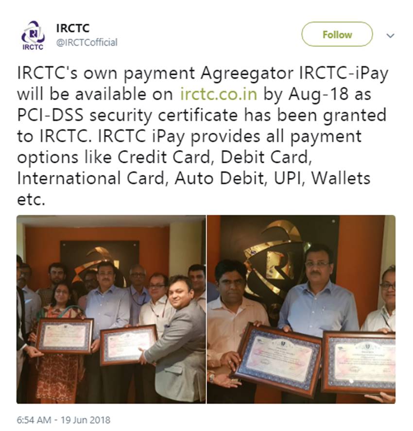 ट्वीट कर कहा गया था कि आईआरसीटीसी खुद का पेमेंट एग्रिटेटर IRCTC-iPay 18 अगस्त से https://irctc.co.in पर उपलब्ध होगा। आईआरसीटीसी को इसके लिए पीसीआई-डीएसएस सिक्योरिटी सर्टिफिकेट भी दे दिया गया है। आईआरसीटीसी की इस सुविधा के अंतर्गत क्रेडिट कार्ड, डेबिट कार्ड, इंटरनेशनल कार्ड, ऑटो डेबिट, यूपीआई और वॉलेट सरीखे सभी पेमेंट के विकल्प मौजूद होंगे।
