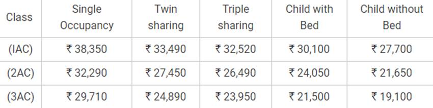 2- थर्ड एसी में इस पैक की शुरुआत 23 हजार 950 प्रति व्यक्ति के किराए से होती है, जो कि ट्रिपल शेयरिंग (तीन लोगों के मामले में) पर मान्य होगा। वहीं, इसी बोगी में ट्विन शेयरिंग (दो लोगों के साथ) करने पर प्रति व्यक्ति के लिए किराया 24 हजार 890 रुपए लगेगा।