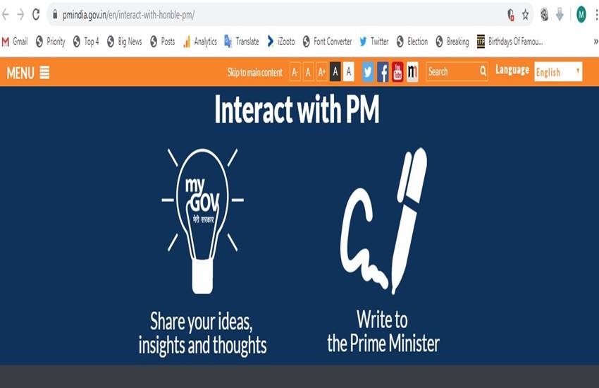 1. पीएमओ इंडिया की वेबसाइट https://www.pmindia.gov.in/en/interact-with-honble-pm/ पर जाएं।