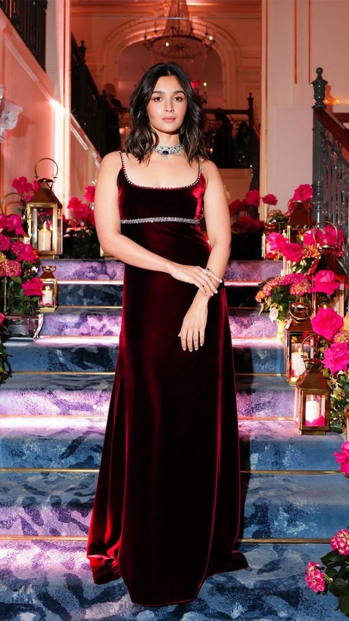 पहली तस्वीरे में आलिया ने वाइन कलर के स्ट्रैपी गाउन के साथ डायमंड-नीलम नेकलेस और मैचिंग रिंग पहनी हैं, जिसकी कीमत 20 करोड़ रुपये है।