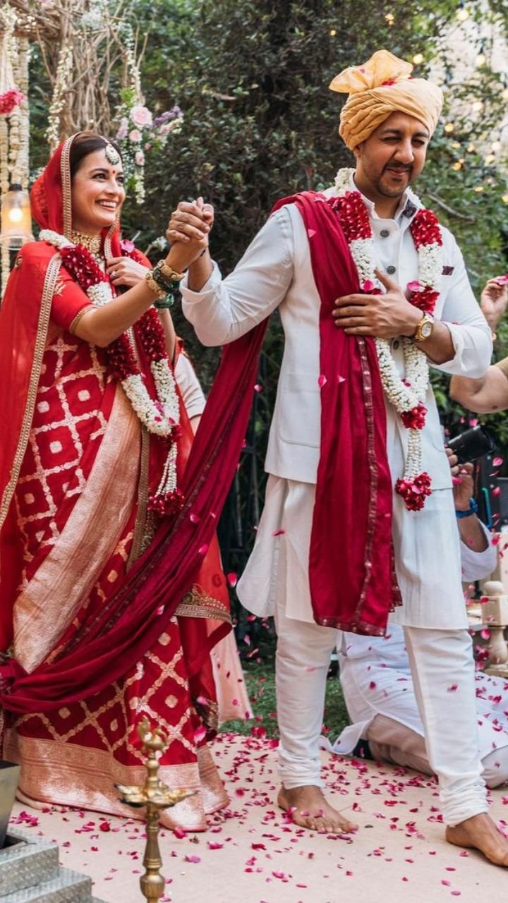 पहली फोटो में दीया, वैभव के गले में माला डालती नजर आ रही हैं।