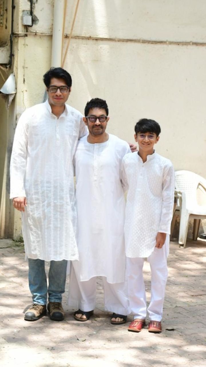 आमिर खान अपने बेटों जुनैद खान और आजाद के साथ अपने घर के बाहर आए जहां तीनों ने मैचिंग सफेद कुर्ता पहना हुआ था।