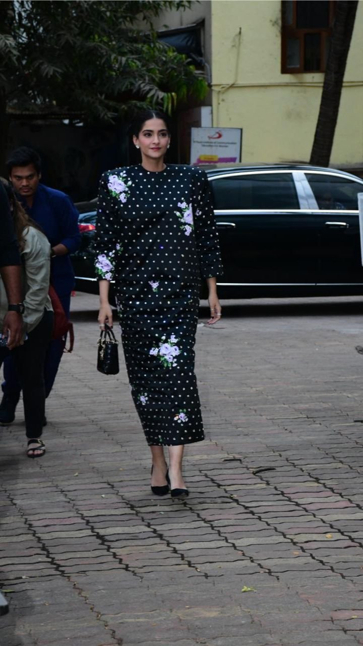 सोनम ने ब्लैक कलर की लॉन्ग ड्रेस पहनी है, जिसपर सितारे लगे हैं। इसके साथ ही इसपर फूल भी बने हैं।