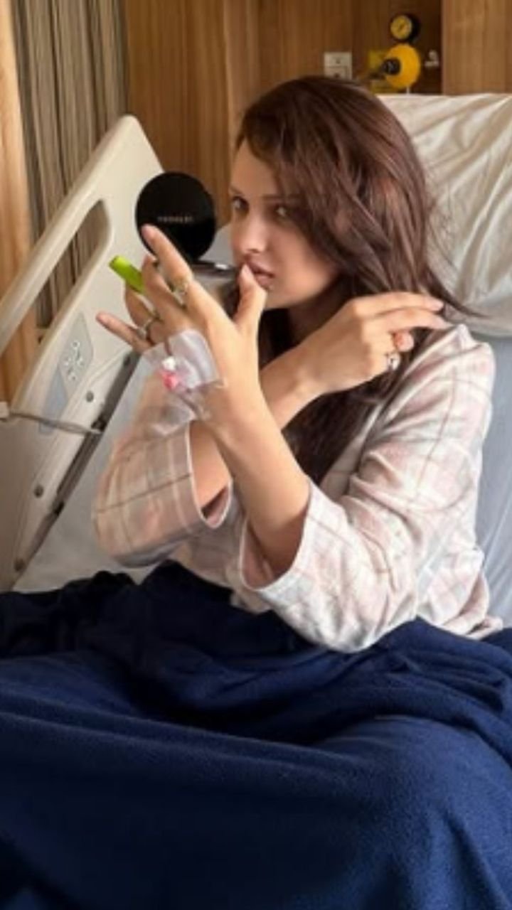 तस्वीरों के कैप्शन में हिमांशी ने बताया है कि वो अस्पताल में भी मेकअप इसलिए कर रही हैं क्योंकि उनका ब्रैंड आने वाला है। Photo-iamhimanshikhurana/insta