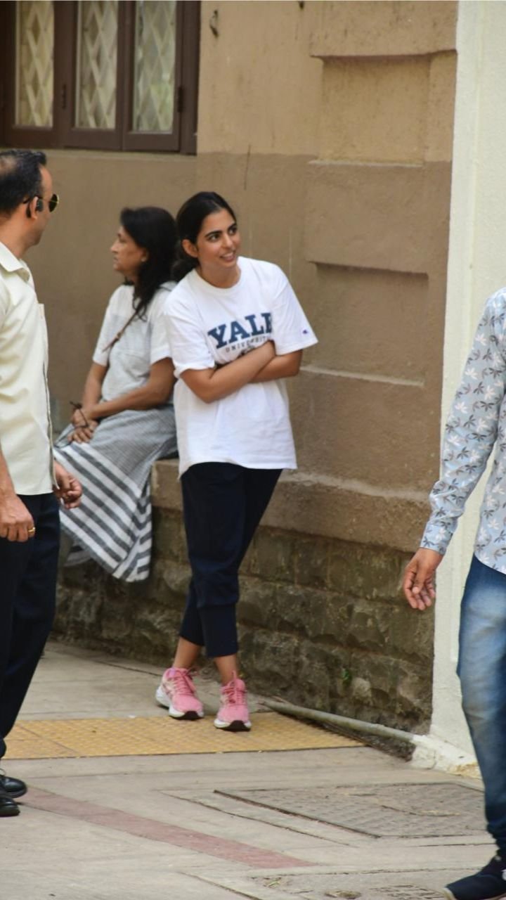 बुधवार को ईशा अन्य लोगों के साथ स्कूल के बाहर अपने बच्चों का इंतजार करती दिखीं।