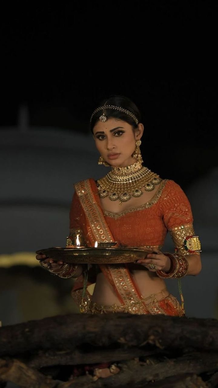 मौनी रॉय इन तस्वीरों में ऑरेंज एंड गोल्डन लहंगां पहने नजर आ रही हैं।
