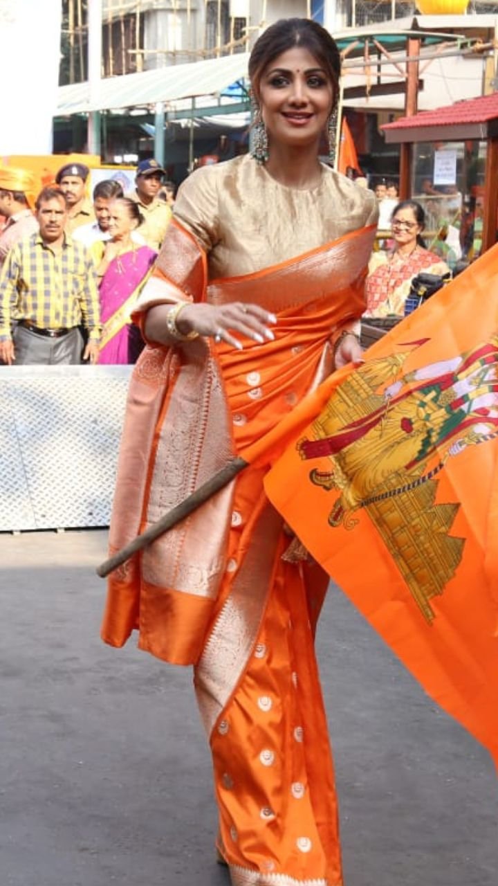 शिल्पा शेट्टी ने भगवा रंग की साड़ी पहनी थी, जिसमें वह बेहद खूबसूरत दिख रही थीं।