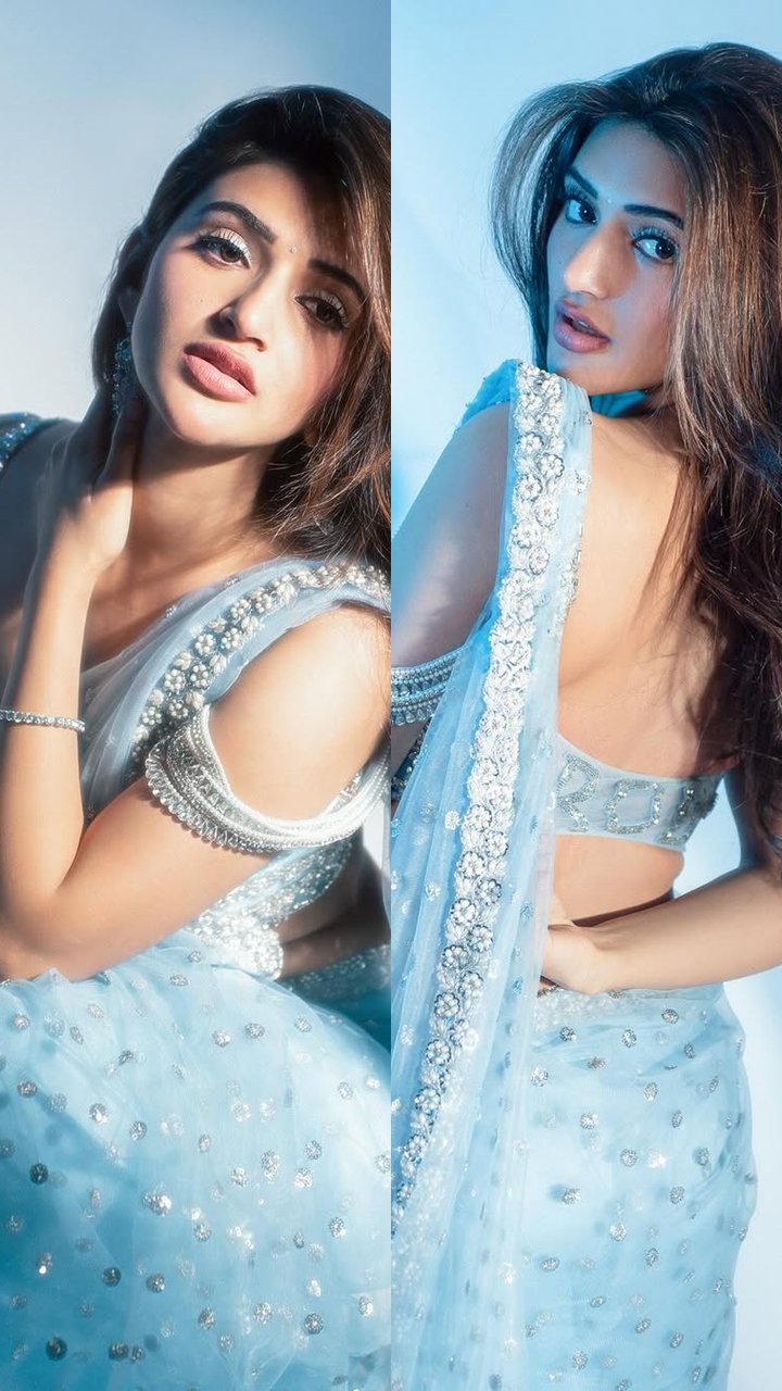 श्रीलीला को नेट वाली नीली साड़ी के साथ बैकलेस ब्लाउज में देखा जा सकता है। उन्होंने न्यूड मेकअप और खुले बालों के साथ अपने लुक को कंप्लीट किया है।