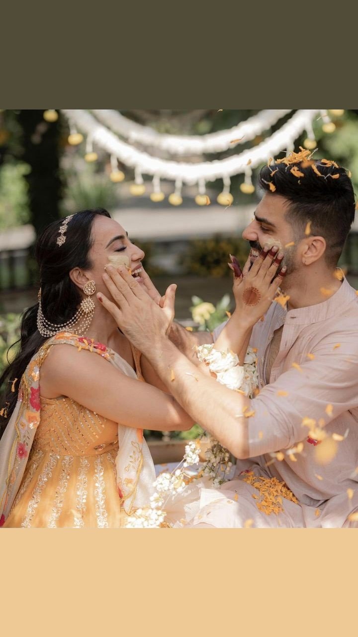 सुरभि ने हल्दी सेरेमनी में ढोलक की थाप पर मस्ती करते हुए डांस किया, जबकि एक तस्वीर में दूल्हा-दुल्हन घास पर लेटकर खूबसूरत पलों को संजोते हुए देखे जा सकते हैं।