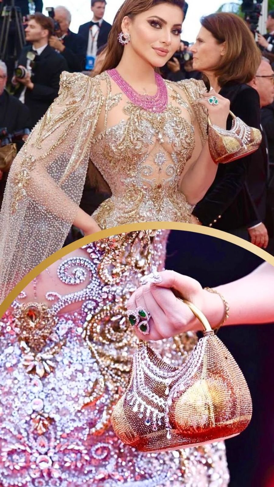 उर्वशी ने रेड कार्पेट पर अपने बोल्ड क्लच को काफी फ्लॉन्ट किया।