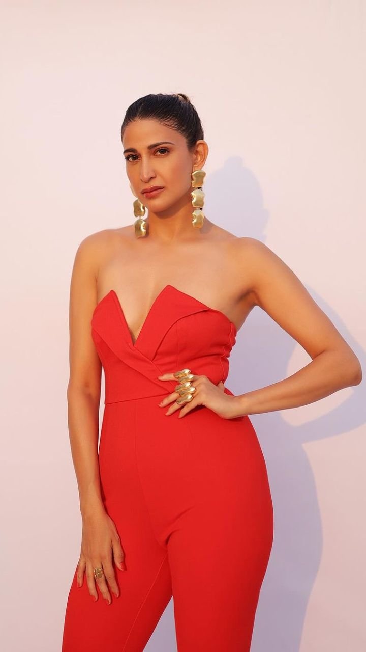अहाना कुमरा ने रेड कलर का जंपसूट पहना है जिसमें वो बेहद ही ग्लैमरस लग रही हैं।