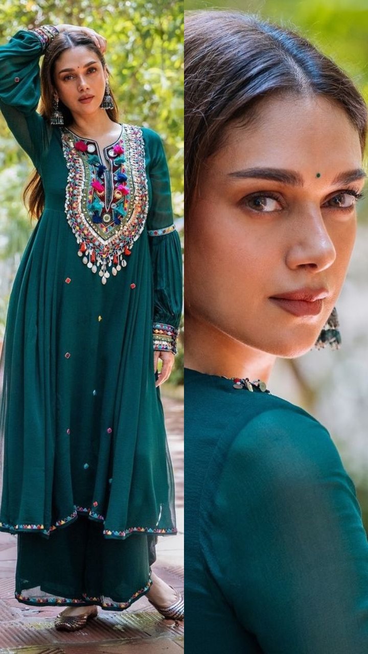 अदिति ने अपने लुक को ग्लैम मेकअप और टू-पार्टेड ओपन हेयरस्टाइल से कंप्लीट किया है।