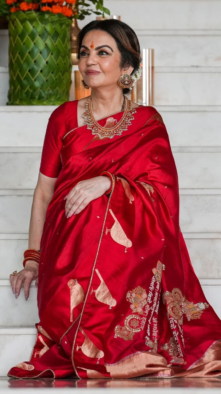 नीता अंबानी की ये लाल रंग की बनारसी साड़ी है जिसमें वो किसी महारानी से कम नहीं लग रही हैं।