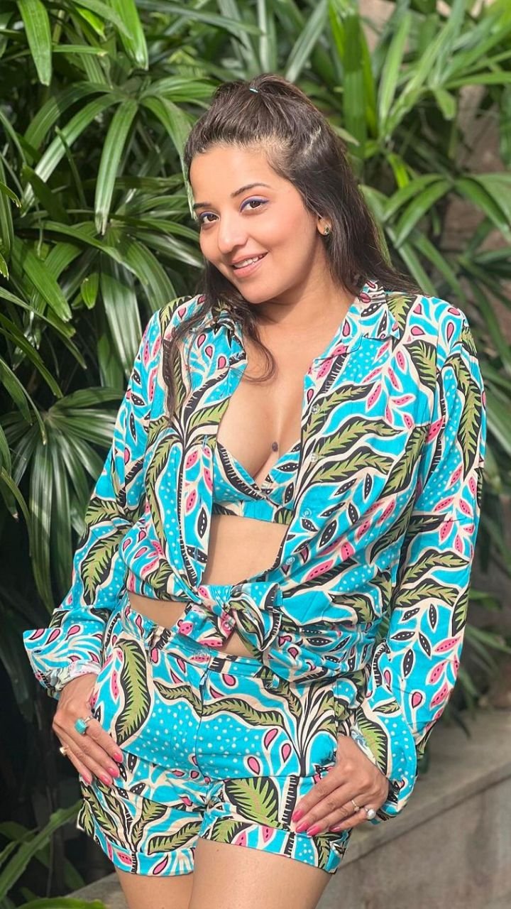 मोनालिसा ने प्रिंटेड शॉर्ट्स पहना है जिसके साथ उन्होंने शर्ट मैचिंग किया है।