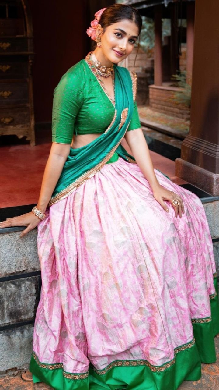 पूजा हेगड़े ने पिंक और ग्रीन कलर का लहंगा साड़ी कैरी किया है।