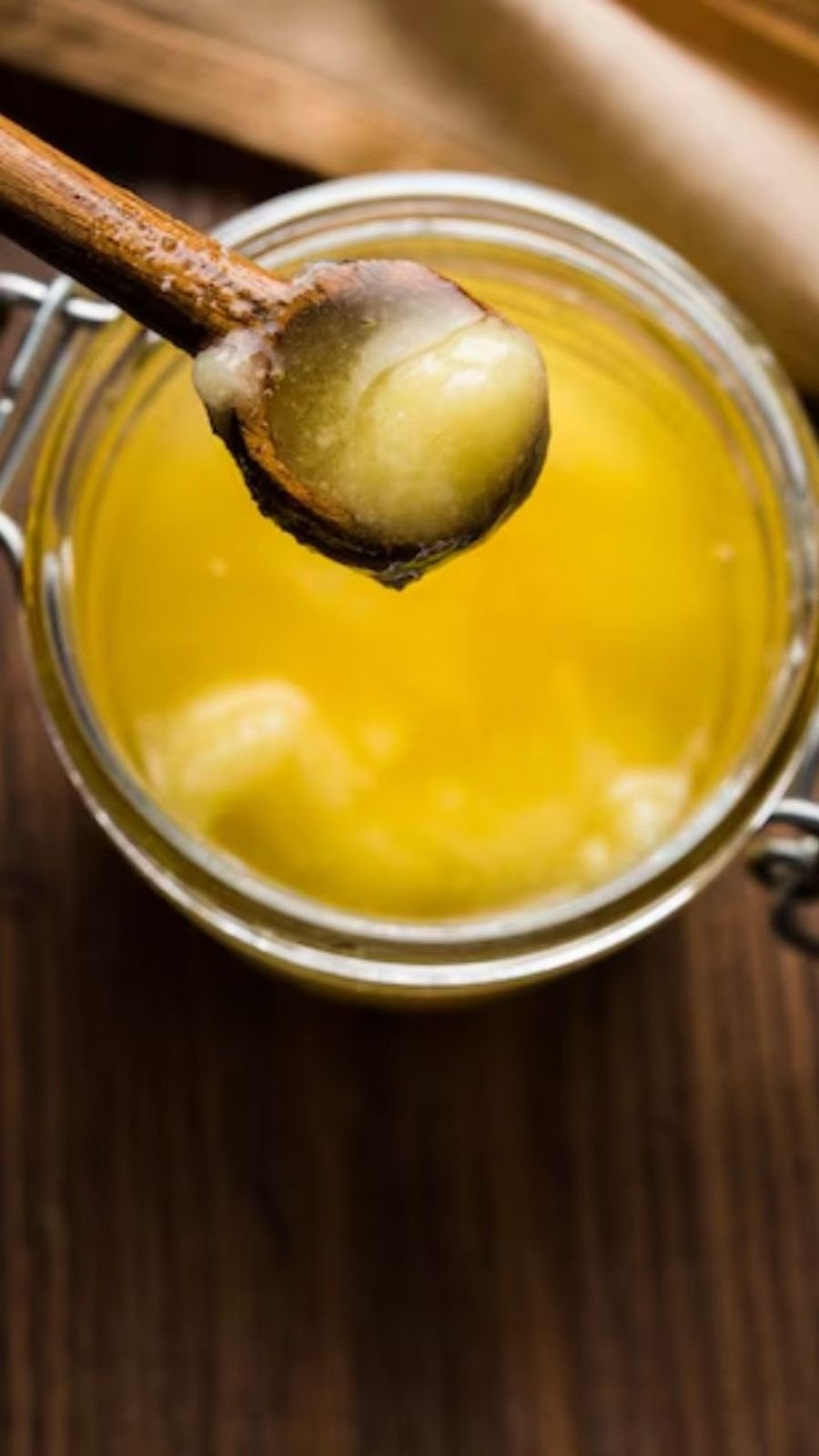 घी में हेल्दी फैट्स और विटामिन E होते हैं, जो स्किन को अंदर से मॉइश्चराइज करते हैं और नेचुरल ग्लो लाते हैं।