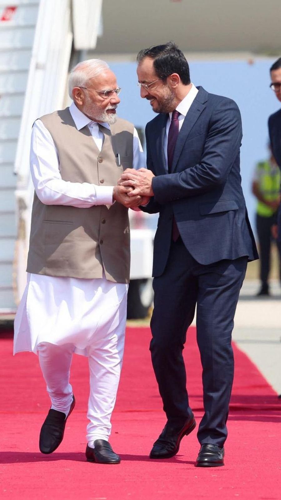 साइप्रस पहुंचने पर PM मोदी का एयरपोर्ट पर राष्ट्रपति निकोस क्रिस्टोडौलाइड्स ने स्वागत किया।