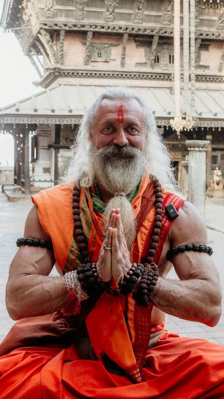 भगवा वस्त्र पहने और गले में रुद्राक्ष की माला पहने 7 फुट लंबे मस्कुलर बाबा रूस के रहने वाले हैं।