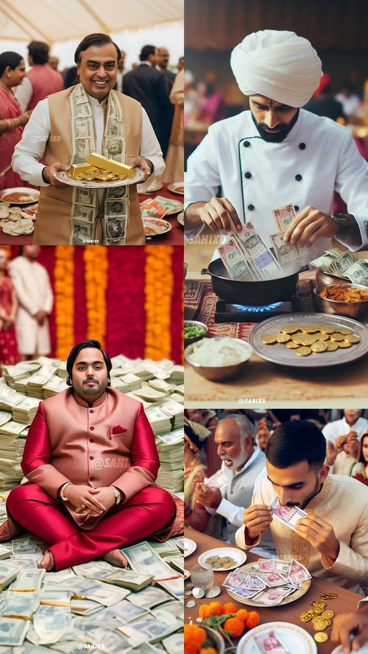 इन तस्वीरों में अनंत अंबानी और राधिका मर्चेंट के प्री-वेडिंग सेलिब्रेशन को दिखाया गया है। इन तस्वीरों में हर तरफ सोने और पैसों की गड्डियां नजर आ रही हैं।