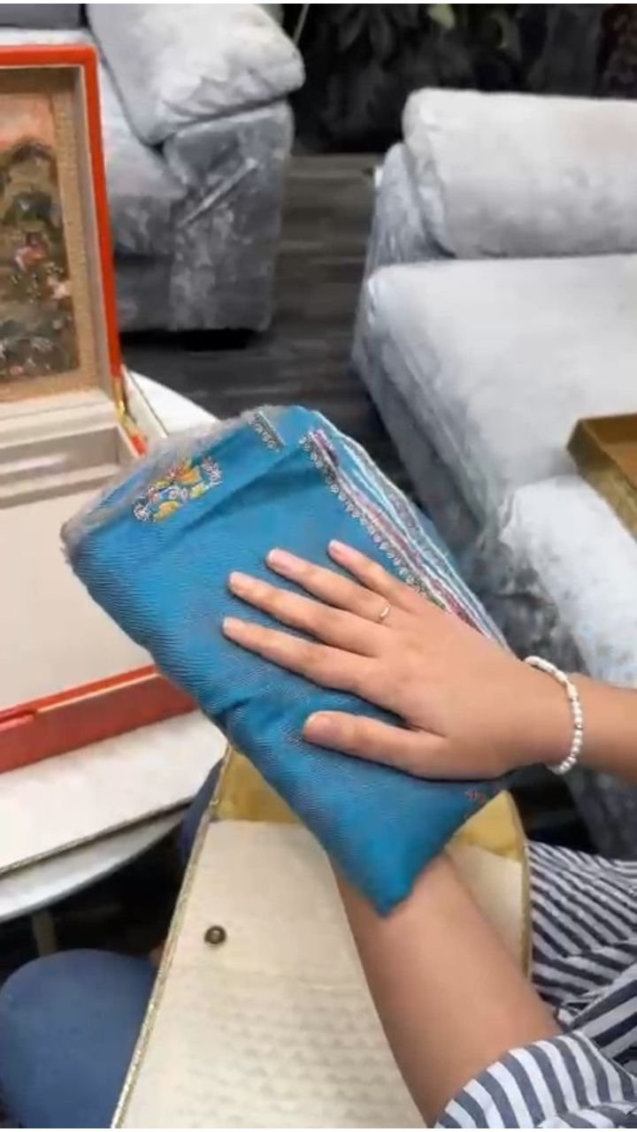 इस कार्ड बॉक्स में आमंत्रण के साथ मेहमानों को एक पाउच में कश्मीर के कलाकारों द्वारा बनाई गई एक दोरुखा पश्मीना शॉल भी दिया गया है। यह शॉल एक तरफ नीला और दूसरी तरफ बैंगनी रंग का है। इस पर बहुत ही खूबसूरत एंब्रॉयडरी की गई है।