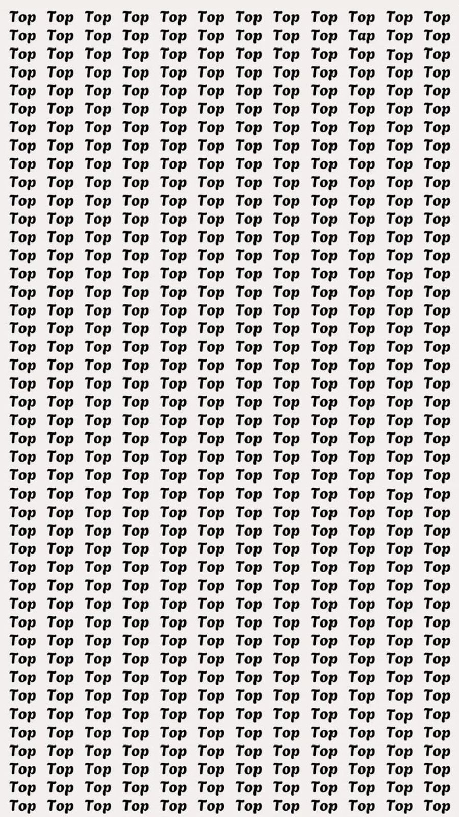 आपको एक ग्रिड में बार-बार लिखा गया Top शब्द दिखेगा। इन्हीं शब्दों के बीच कहीं न कहीं Tap छिपा हुआ है। आपकी चुनौती है कि आप इस शब्द को सिर्फ 8 सेकंड में ढूंढ लें।